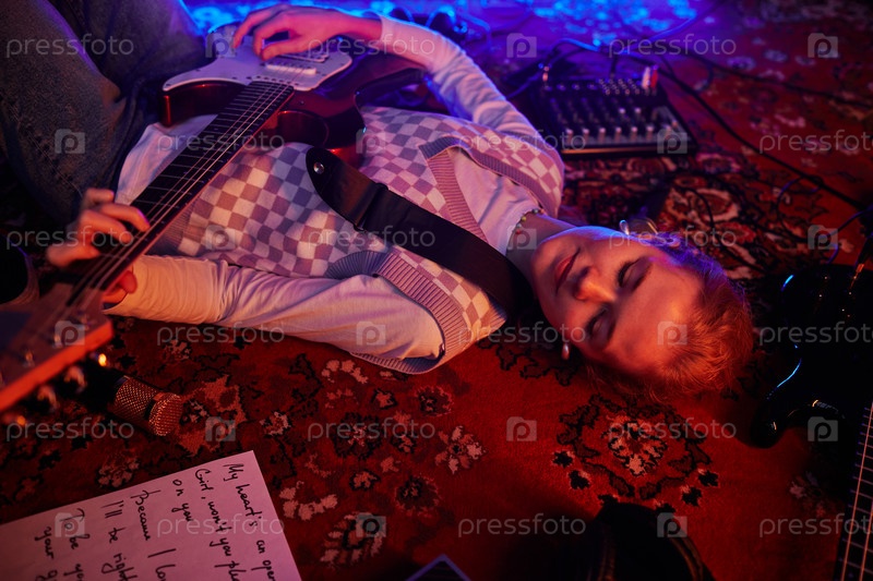 Молодая женщина, играющая на гитаре лежащая
