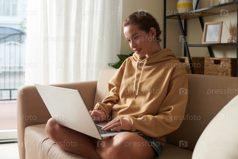 Молодая женщина, использующая ноутбук дома