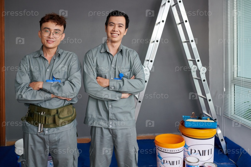 Портрет положительных строителей, стоящих в доме, концепция ремоделирования