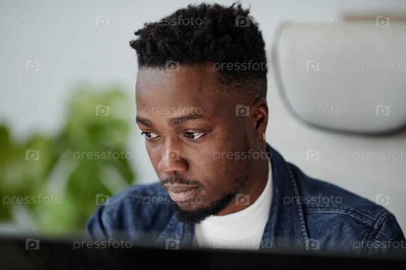 Молодой серьезный афроамериканский бизнесмен смотрит на компьютерный экран