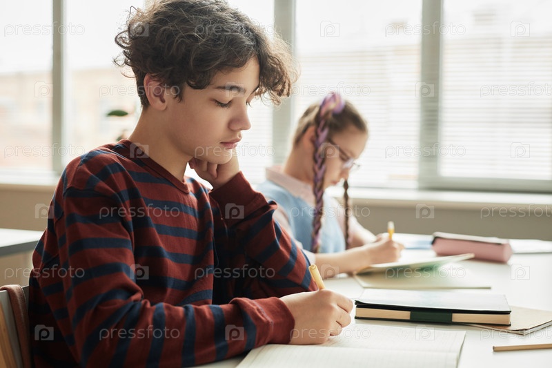 Подросток с кудрявыми волосами пишет в блокноте во время школьного занятия