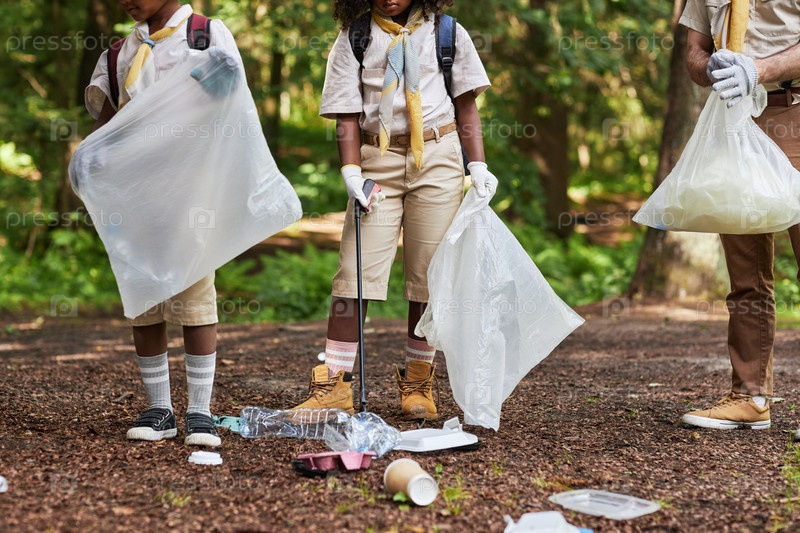 Низкий участок группы скаутов, собирающих мусор в лесу