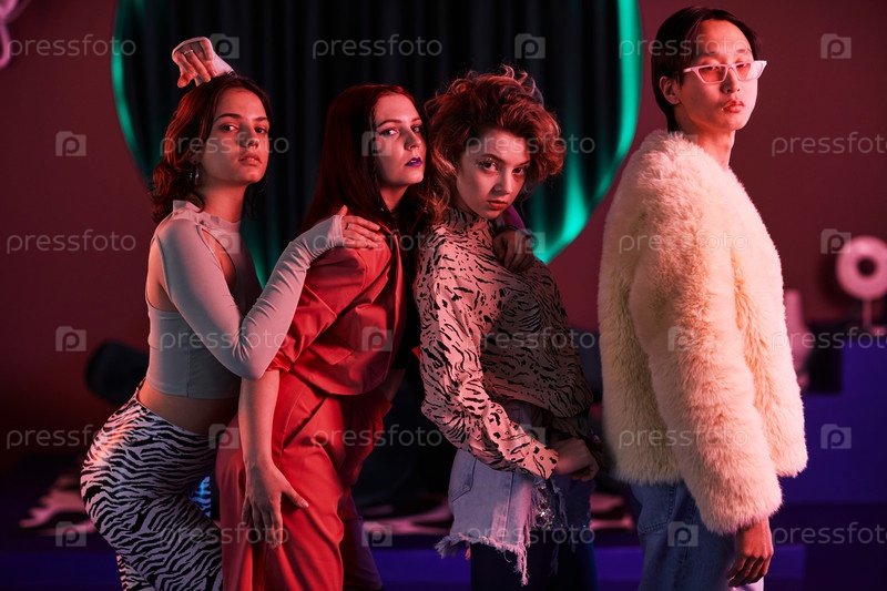 Группа молодых людей в Красном неоновом клубе