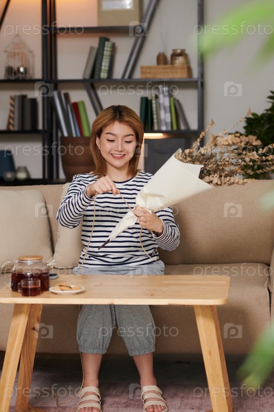 Женщина, упаковывающая бумагу на цветы
