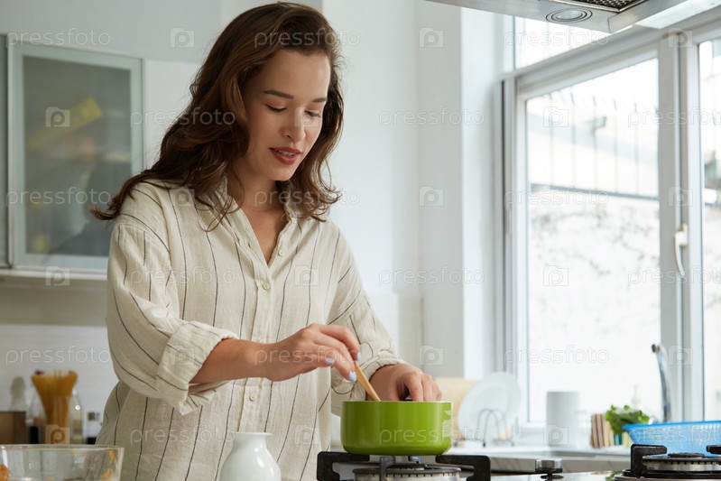 Женщина, готовящая кастрюлю с супом