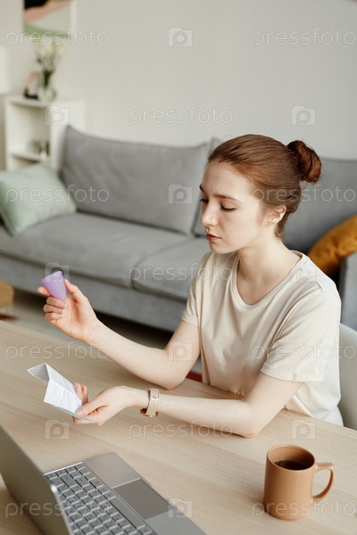 Молодая женщина читает инструкцию по менструальной чашке
