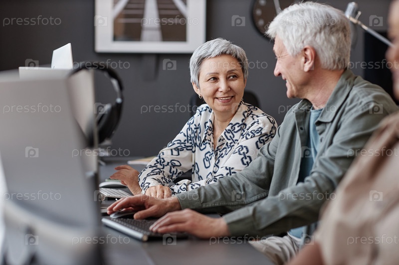 Два улыбающихся старшеклассника в классе компьютеров учатся новым технологиям