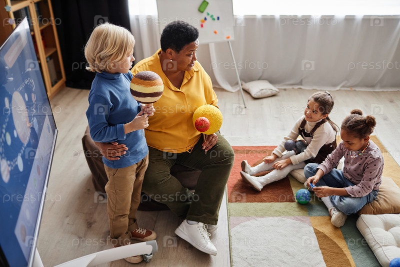 Две маленькие девочки слушают своего учителя и одноклассницу