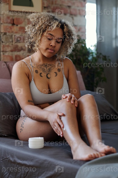 Молодая женщина в нижнем белье сидит на кровати и наносит крем на ноги