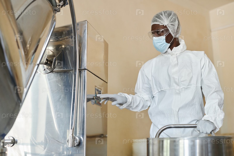 Молодой чернокожий мужчина в защитном костюме использует оборудование для работы на фабричной мастерской