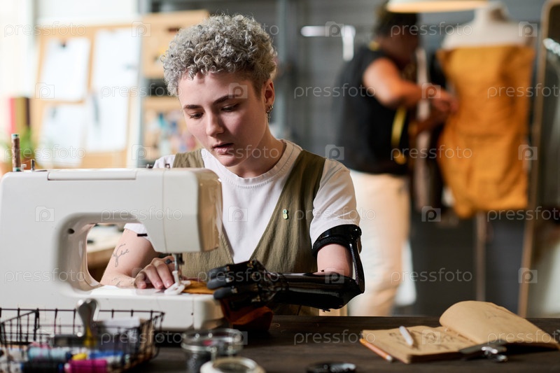 Молодая серьезная швея с частичной рукой шит одежду на электрической машине