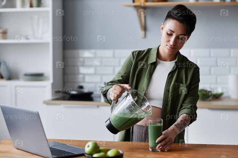 Беременная молодая женщина делает смузи на завтрак в кухонной обстановке