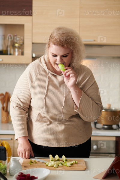 Женщина режет яблоко для фруктового салата