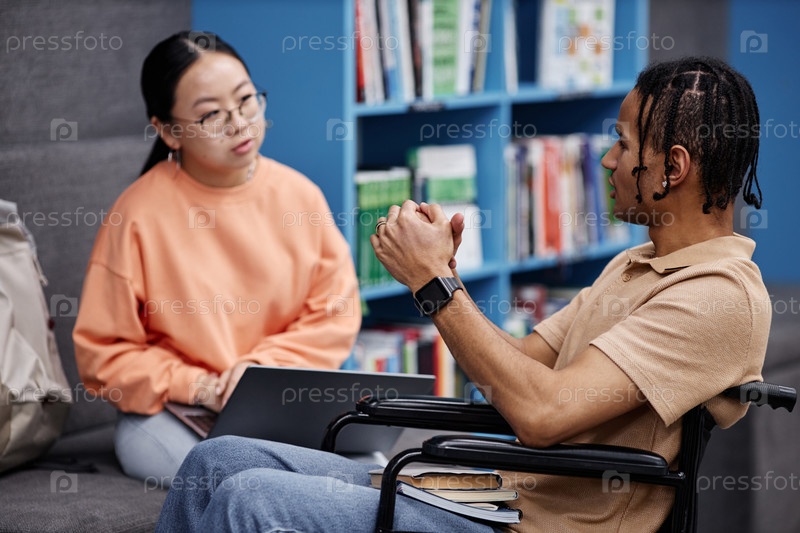 Чернокожий молодой человек с инвалидностью разговаривает со своим другом в библиотеке