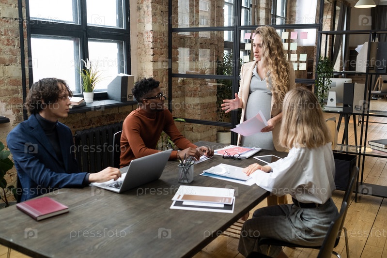 Беременная бизнес-леди представляет свой отчет на совещании