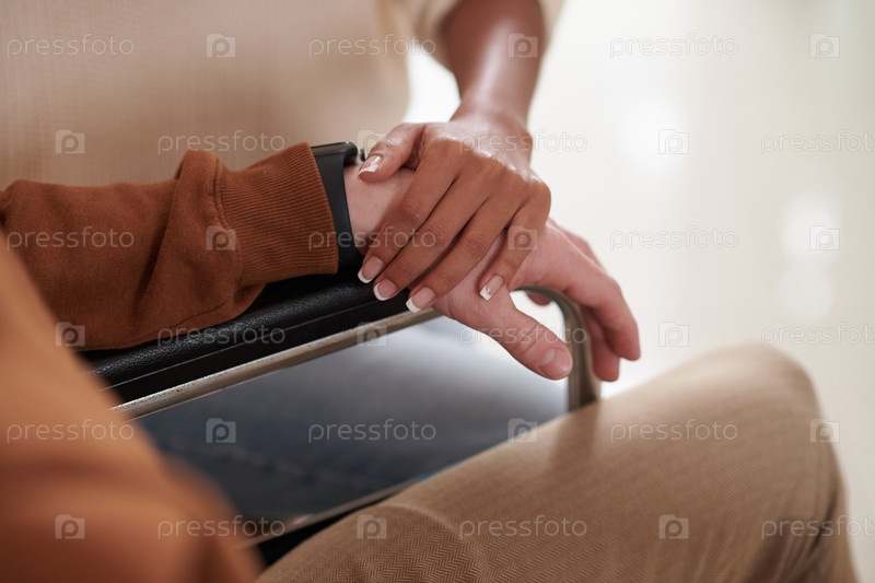 Женщина, прикасающаяся к руке бойфренда в инвалидном кресле