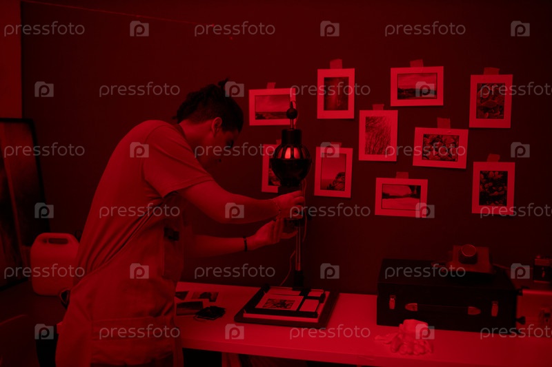 Фотограф делает фотографию в темной комнате