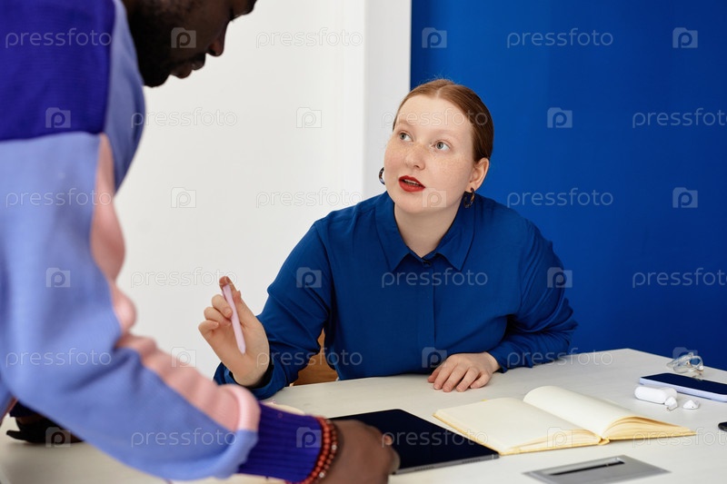Красочные два молодых человека обсуждают проект в офисе на синей стене