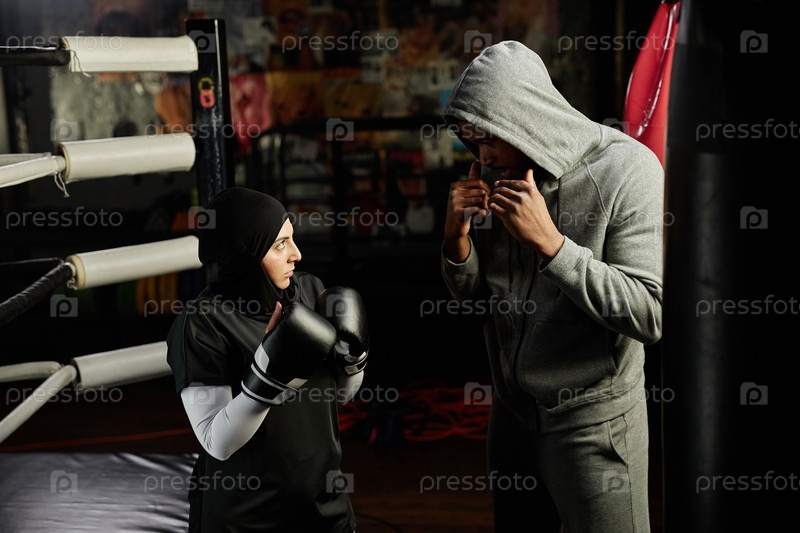 Молодая мусульманка в перчатках и хиджабе слушает инструктора