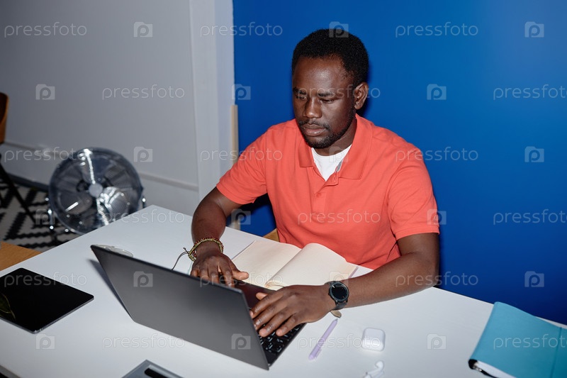 Живой сосредоточенный чернокожий мужчина, использующий ноутбук за столом против синего