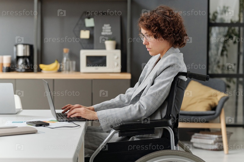 Женщина-инвалид работает на ноутбуке в офисе