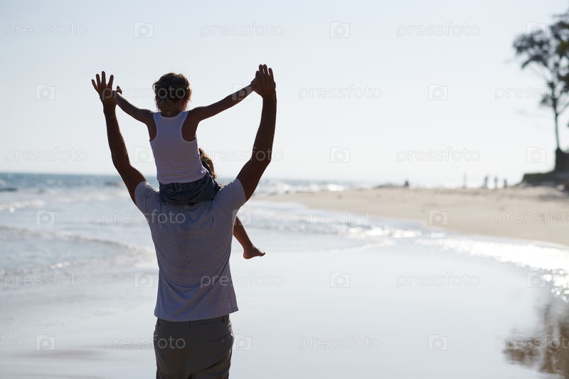 Отец и дочь гуляют на пляже