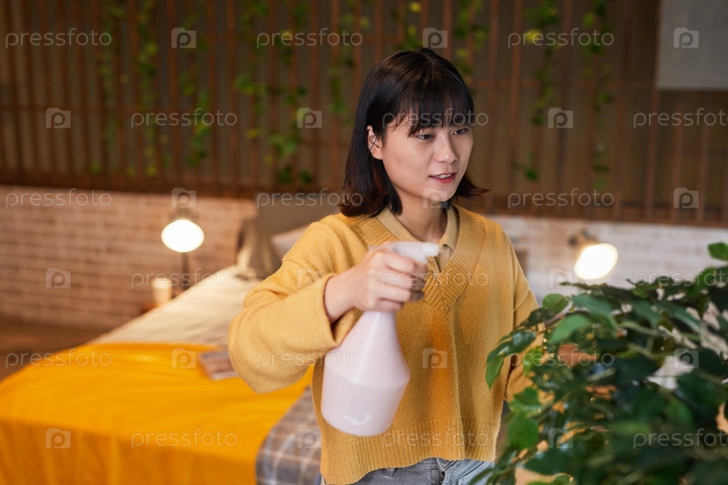 Улыбающаяся молодая женщина поливает растения