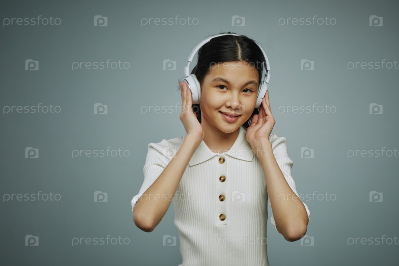 Улыбающаяся юная азиатская девушка прикасается к наушникам, слушая музыку
