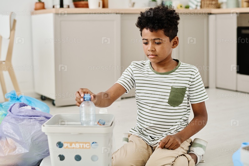 Мальчик сортирует пластиковые бутылки в контейнеры