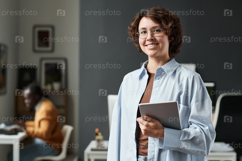 Офисный работник с планшетным компьютером, стоящий в офисе
