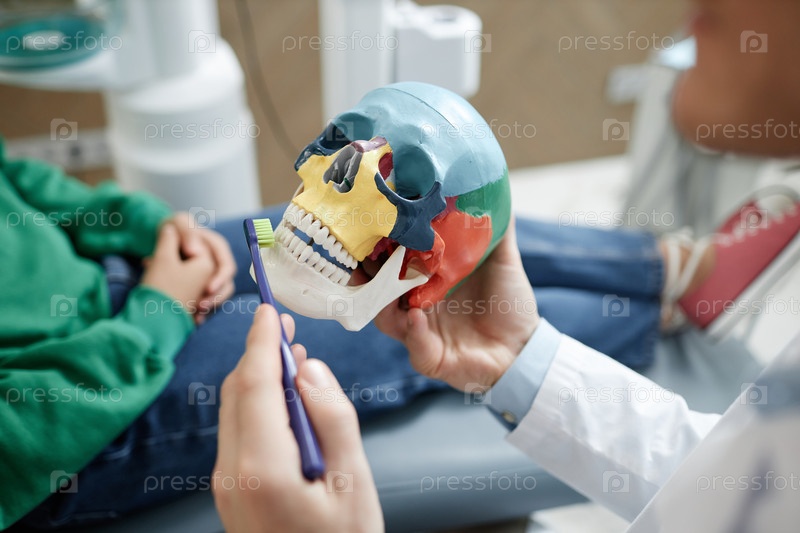 Ближайшее изображение мужского стоматолога, демонстрирующего технику чистки зубов в стоматологической клинике