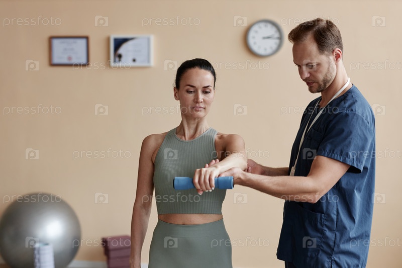 Женщина, тренирующаяся на гантеликах во время реабилитации