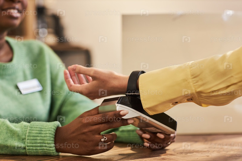 Непризнанная молодая женщина платит через умные часы в магазине