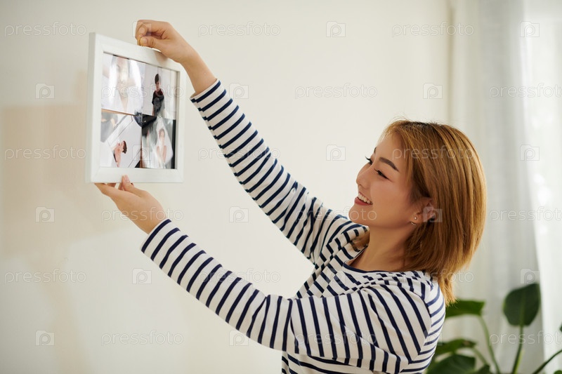Женщина, повесившая фотографию на стене