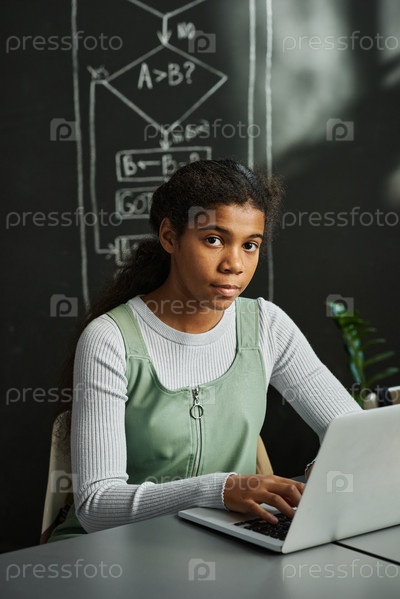 Афроамериканская школьница учится на компьютере