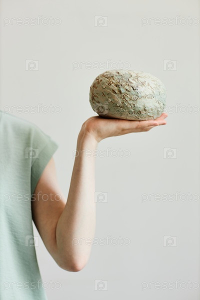 Рука держит сырую текстурированную керамическую вазу, wabi sabi design