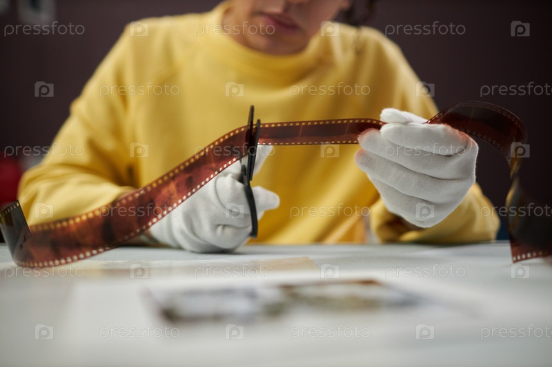 Фотограф режет фотопленку ножницами в студии