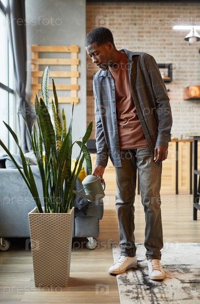 Молодой человек поливает растения дома