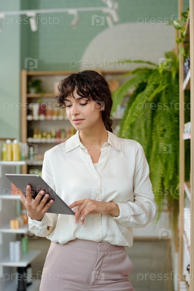 Молодая уверенная в себе бизнесвумен с планшетом проверка цен на продукты самообслуживания