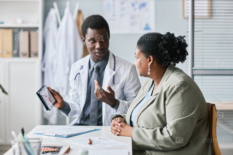 Чёрная женщина с избыточным весом слушает врача в клинике