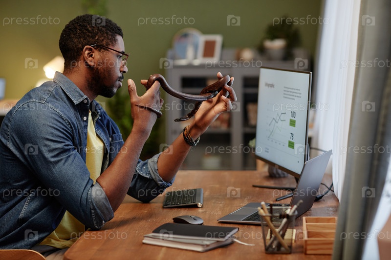 Молодой бизнесмен с крысиной змеей в руках анализирует графические данные