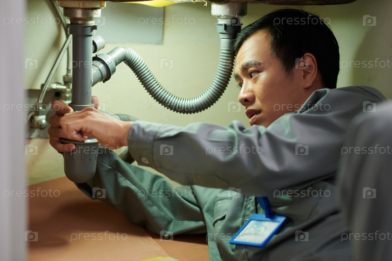 Сантехник очищает забитую трубу под кухонной раковиной