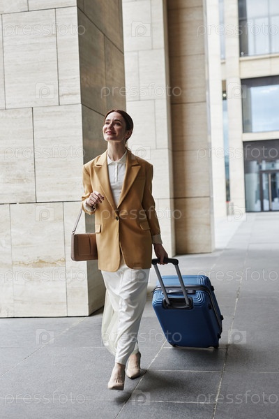 Молодая красивая бизнес-леди в тихом роскошном наряде тянет чемодан с багажом