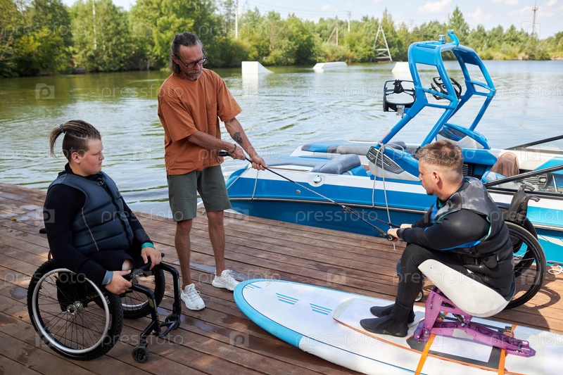 Спортивный инструктор преподает мужчине с инвалидностью урок вейкбординга на пире
