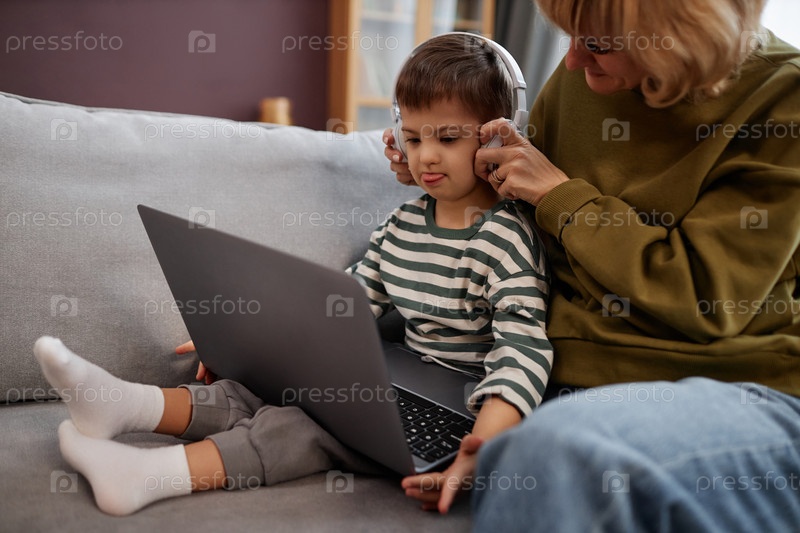 Заботливая мать надевает наушники на маленького мальчика с синдромом Дауна