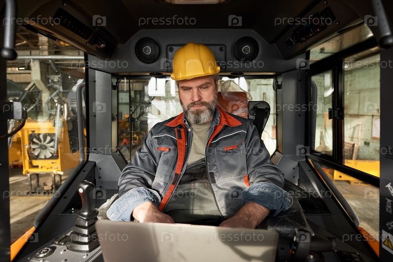 Рабочий, управляющий машиной на строительной площадке