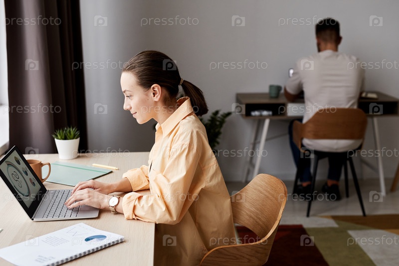 Боковой вид молодой уверенной брюнетной бизнес-жены, которая смотрит на графические данные