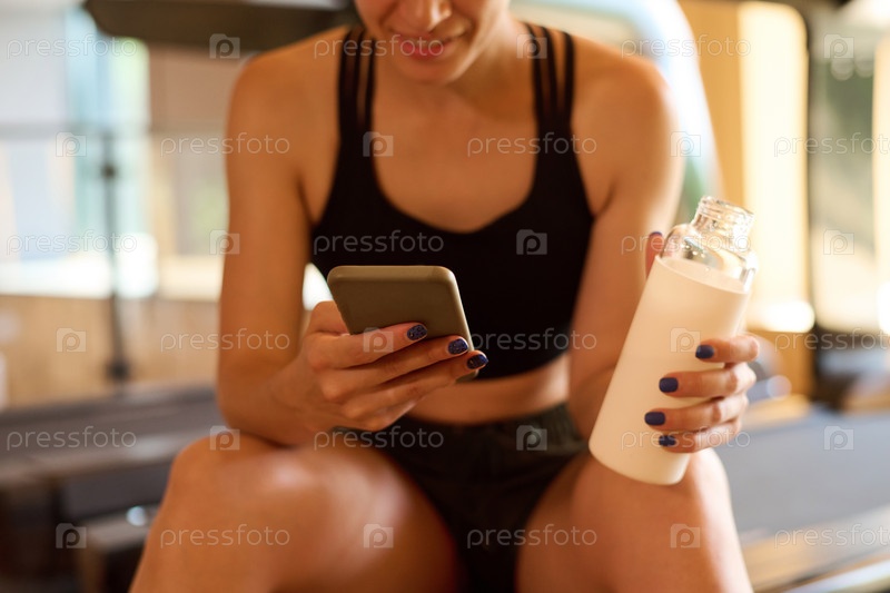 Женщина, использующая мобильный телефон в спортзале