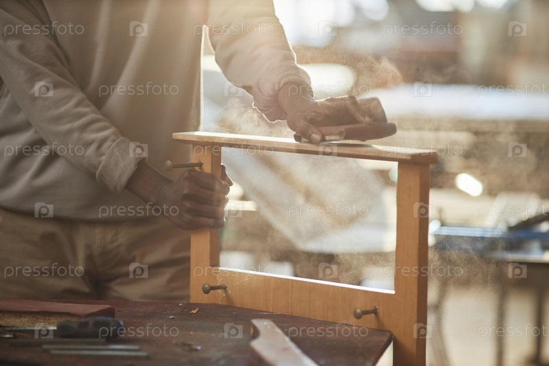 Ближайшее изображение чернокожего мужчины, шлифовающего деревянную мебель в столярной мастерской