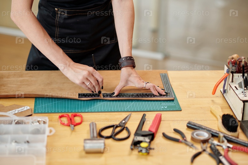 Ремесленник режет кусок кожи
